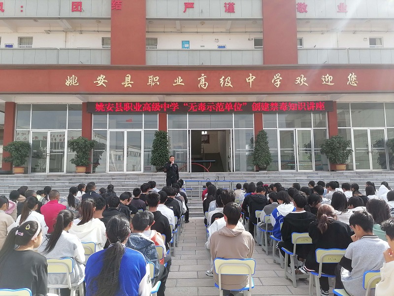 3月29日下午,县公安局禁毒大队周贤一行应邀到县职业高级中学开展“无毒示范单位”创建禁毒知识讲座暨“国家反诈中心”APP安装宣传活动。