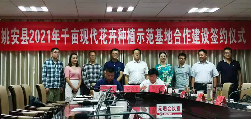 2021年7月26日,昆明国际花卉拍卖中心有限公司董事长曹荣根一行到姚安县,与县人民政府签订姚安县2021年千亩现代精品花卉种植示范基地合作建设协议。