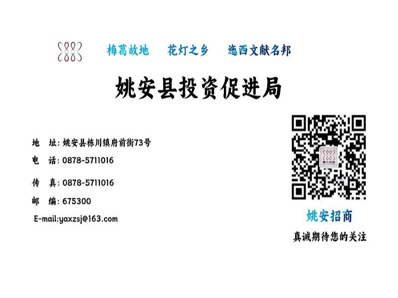 资源优势:姚安县属亚热带季风气候,年平均气温17.1℃,年平均降雨量569.3毫米,年平均日照时数2348.9小时,无霜期247天;年平均降雨产水量14.99亿立方米,年径流量4亿立方米。气候温和、日照充足、地势平坦、土壤肥沃、无工业污染,农业基础条件好。