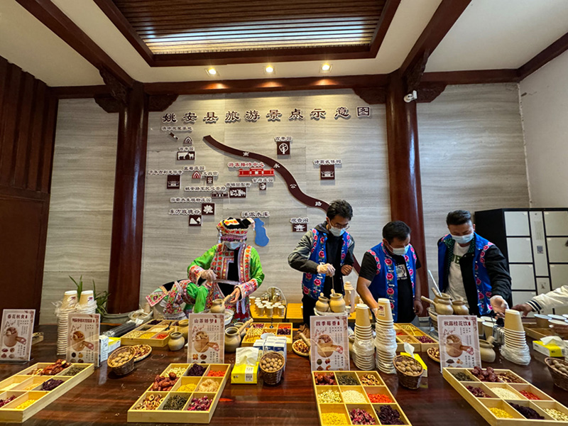 “姚小花”景点有非物质文化遗产展览馆,可以沉浸式体验彝族刺绣、陶器烧制、葫芦笙制作、传统制糖等技艺,还可以吃到各种中彝医药食同源美食。“小邑拉花”景点内有姚安土特产销售、药食同源餐饮及各种特色小吃。