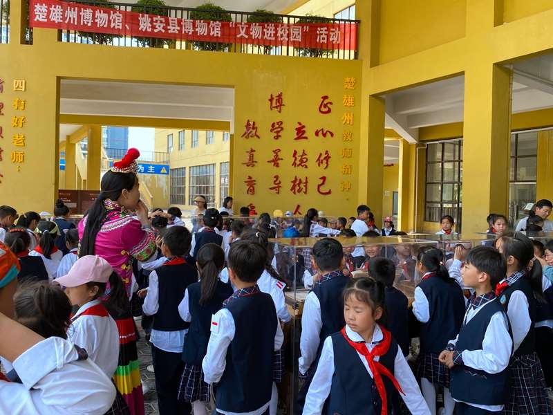 把珍贵文物展览送进校园。5月31日,楚雄州博物馆和县博物馆深入县思源实验学校、太平中心小学共同开展“文物进校园”活动,使学生们不用走出校园,就可以与这些远古器物近距离接触,同时还可以观看介绍世界恐龙之乡动漫视频、楚雄州历史文化人物和革命人物的视频短片,让学生亲自体验凿挖模型恐龙,丰富了“第二课堂”内容,促进儿童更好地了解和感悟家乡历史,增强了对家乡悠久历史、灿烂文化的自豪感,坚定了热爱家乡、建设家乡的自信心。此次活动共展出展板100 余块,展出流动展柜15个,展出流动文物60余件,参观师生达3000余人次。“举办这样的活动不仅可以强化素质教育,提高学生审美意识,这种‘活态化’形式的博物馆也更易于被孩子们接受,让学生更深入、直观地了解我们的古老历史,加强学生对文物保护意识,对我们做好德育工作也有很大帮助。”思源实验学校校长杨文学说。