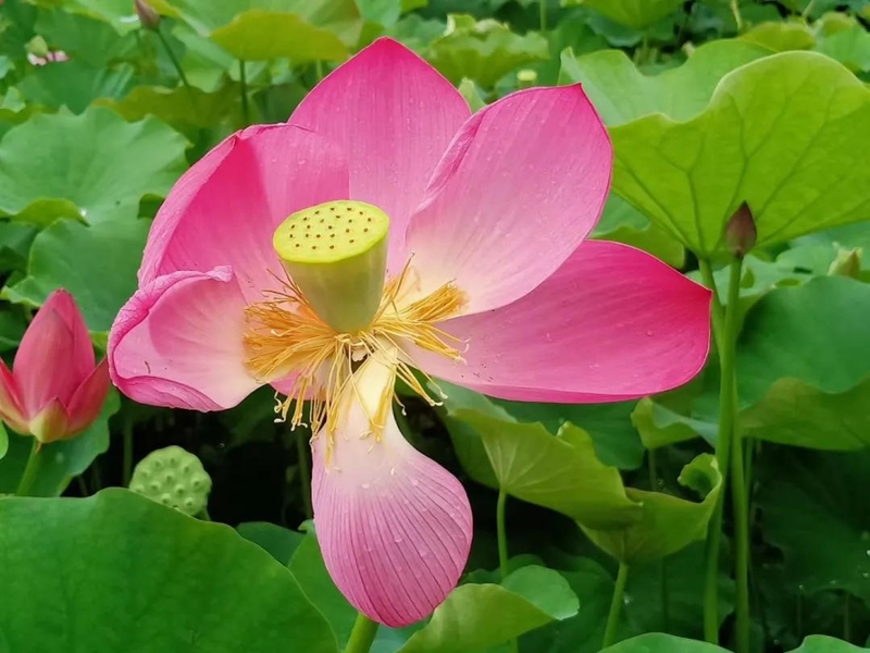 荷花之美,美在骨气,美在脱俗!其实,荷花之美,还在于它的果实。东坡西湖泛舟,觅得莲蓬,喜不自胜:“旋折荷花剥莲子,露为风味月为香。”其美味鲜美独特,足以醉人。陆游被贬闲居,着墨于田园:“大儿锄豆溪东,中儿正织鸡笼,最喜小儿无赖,溪头卧剥莲蓬。”此闲适景致,与世外桃源无二。