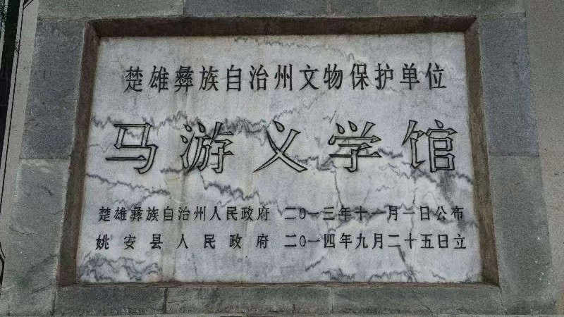 据《道光姚州志》载,马游义学馆建于清雍正十二年(1734年),为知府藏珊、知州王允洪、胡骧创建。同治九年(1870年)、光绪十七年(1891年),经乡人王耀宗、骆朝相、张兴倡义捐资两次重建,由原来的茅草房变为瓦房。整座义学馆依山势坐西朝东,占地面积318.6平方米,由大门、正堂、两厢、两耳组成,单檐硬山顶,抬梁式土木结构,正殿面阔3间,进深3间,两厢面阔均3间,进深均3间,南、北耳房面阔均2间,进深均1间。大门分上下两层,上层有明显的翘角,整个建筑结构是典型四合院风格。马游坪办学迄今已有274年,培养了千计的莘莘学子,2000年姚安“11.5”地震,义学馆严重受损变成危房,学校迁址重建。2008年经上级拨款及村民积极筹建重修。2019年姚安县文化和旅游局争取资金15万元对其进行地仗油饰修复修缮以及在义学馆正堂布置了历史文物及民俗文化展厅。马游义学馆于2010年12月由姚安县人民政府公布为县级文物保护单位、2013年3月由楚雄州人民政府公布为楚雄州文物保护单位。(何晓霞/文 李有高/图)