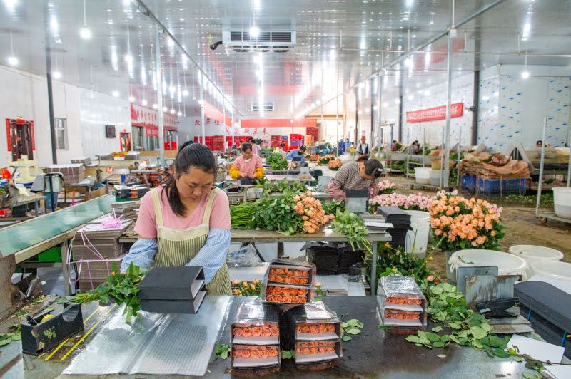 在产业链延伸方面,姚安县构建了从种苗研发、规模种植、精深加工到市场销售的完整产业链。在种苗研发环节成效显著。在种植环节,建成智能温室7130亩,实现了生产的标准化和智能化;在加工环节,开发了鲜花饼、鲜花酒、精油、干花等系列产品;在销售环节,建成了姚安国际花卉农特产品展示交易中心,日饱和拍卖交易量可达700万枝以上。