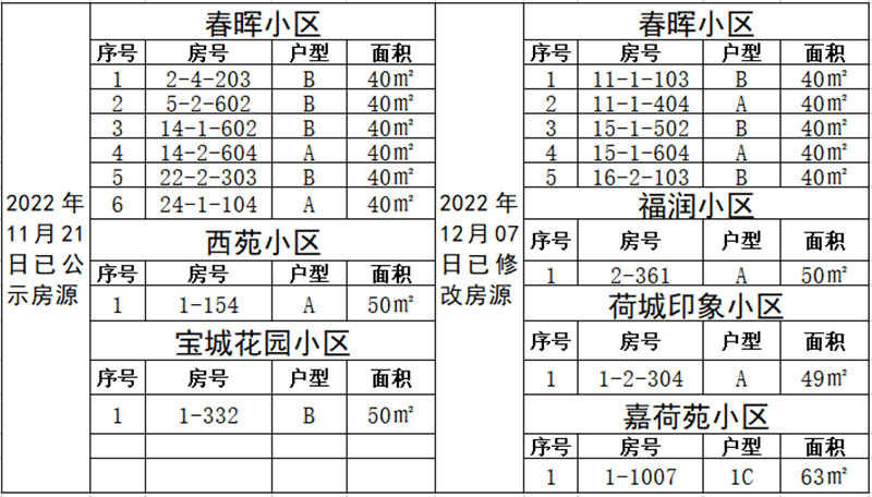 姚安县住房和城乡建设局于2022年11月21日至2022年12月5日将姚安县2022年9-12月公共租赁住房空置房源进行公示,公示期为15天,已公示的空置房源经保障性住房建设管理中心工作人员再次察看确认后,部分空置房源存在卫生间漏水、地板鼓包、墙面白灰脱落等问题,为保障待分配的公共租赁住房房源质量,保障性住房建设管理中心迅速组织人员进行维修修缮,由于维修工期长、施工工艺复杂等,已公示的部分空置房源不能作为本次分配房源,现将重新调整后的空置房源公示如下: