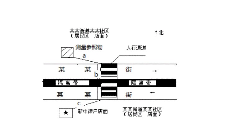(1)主干道上有禁止行人行走的隔离带的(包括禁止通行的双黄线、单黄线等交通标志),从隔离带最近开口处过斑马线 垂直距离的“边对边”测量标准。 新申请人与参照物间距=a+b+c。