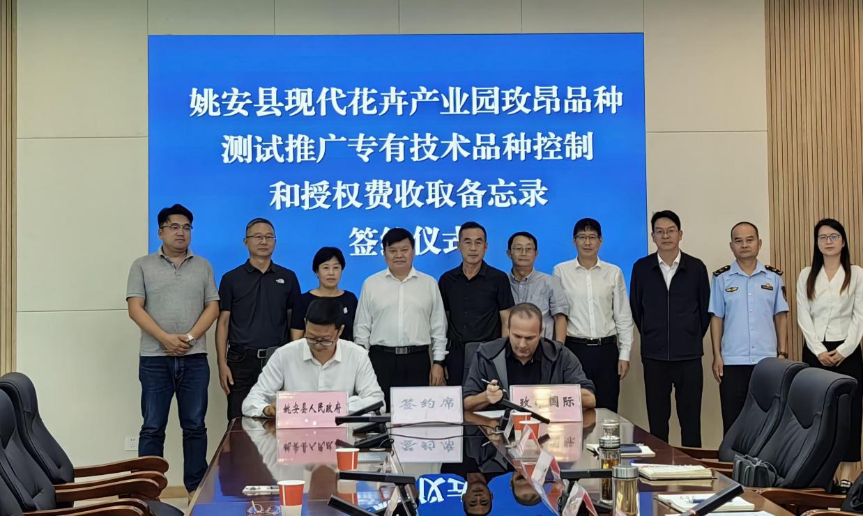 姚安县举行姚安县现代花卉产业园玫昂品种测试、推广、专有技术、品种控制和授权费收取备忘录签约仪式
