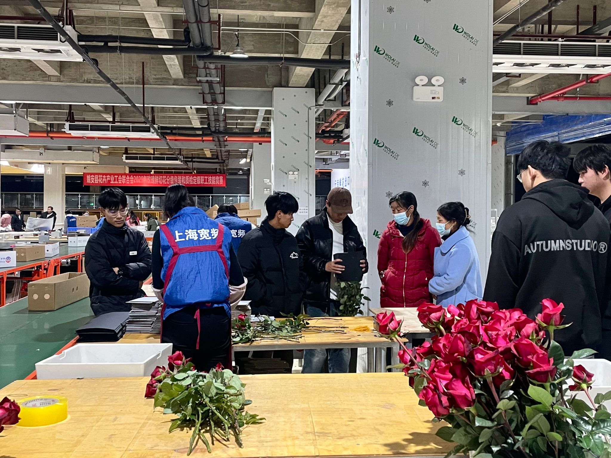 在花卉拍卖中心,学生们在工作人员引导下,系统观摩了月季鲜切花从采后分级、包装到质检的完整流程。技术骨干详细讲解了花卉保鲜技术、质量等级标准及市场交易模式,使学生们将田间实验与市场实际紧密结合,实现了从“如何种好”到“如何卖好”的知识贯通。