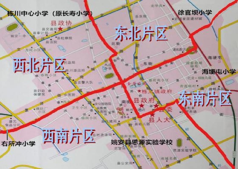 根据就近原则和学校实际情况进行如下划分:以老十字街中心线延长分为四块,1.居住在西正街以南,南正街以西(西南片区)地到思源实验学校报名;2.居住在西正街以北,北正街以西(西北片区)地到长寿学校报名;3.居住在东正街以南,南正街以东(东南片区)地到海埂屯小学报名;4.居住在东正街以北,北正街以东(东北片区)地到徐官坝小学报名,具体划分情况如图所示: