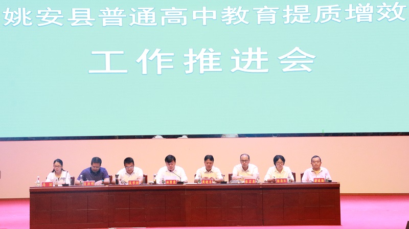 2022年7月12日,姚安县委、县人民政府在姚安一中报告厅召开普通高中教育提质增效工作推进会。县委副书记、县长林帮荣,县政协主席周晓东,县委常委、县人民政府常务副县长吴学剑,县委常委、县人民政府副县长张宏勇,县人大常委会副主任杨海虹、县人民政府副县长马丽、县政协副主席潘建勋,楚雄州教育体育科学研究所所长自洪明、副所长杨修昌出席了推进会;部分县级部门主要领导,县教育体育局领导班子成员、股室负责人,县属学校校(园)长、书记、姚安一中全体教职工,祥云祥华中学派驻姚安一中管理团队参加了推进会。推进会上县人民政府副县长马丽宣读了姚安一中党总支书记、姚安一中校长的任免决定,县委副书记、县长林帮荣为新聘任的姚安一中校长高艳艳颁发了聘书,姚安一中党总支书记刘建忠、校长高艳艳分别做了表态发言,楚雄州教育体育科学研究所所长自洪明做了指导讲话。