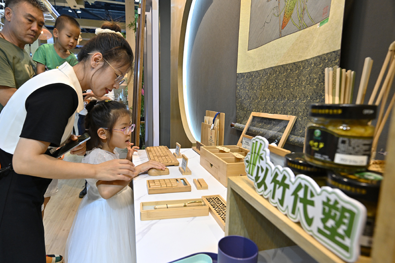 9月2日,观众在服贸会上体验竹制鼠标键盘。 新华社记者 李鑫 摄