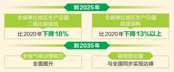 根据《规划》,到2025年,全省单位地区生产总值二氧化碳排放比2020年下降18%,全省单位地区生产总值能源消耗比2020年下降13%以上。产业结构和能源结构进一步优化、适应气候变化能力不断提升、试点示范取得显著进展、气候治理能力取得重要成果。《规划》展望了2035年远景目标。2035年全省气候治理能力全面提升,碳排放总量已与全国同步实现达峰,经济社会已稳步进入高质量发展阶段,中国最美丽省份全面建成。