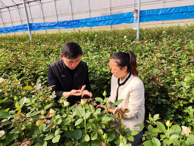 受冬季低温、霜冻影响,部分企业的切花月季主流品种“粉红雪山”出现枝条过细、花色不鲜艳、花瓣皱缩等问题,在实地调研与技术交流后,农科服务团向企业提出肥水比例与灌溉时间调整建议,并向企业技术人员亲身示范切花月季株型培养方法,帮助企业提高产量。