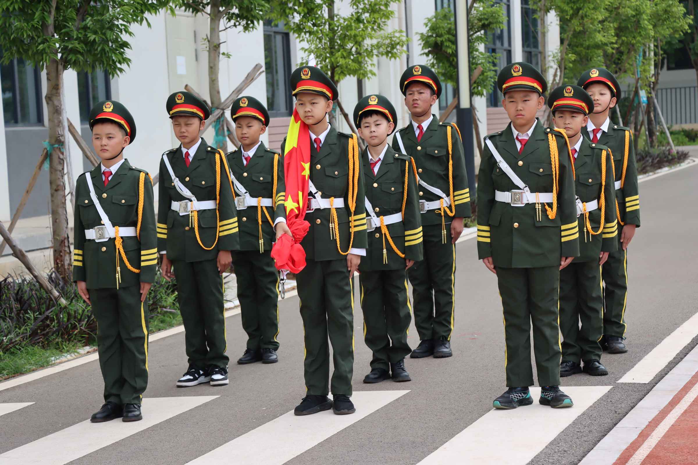典礼在《运动员进行曲》中启幕,学校国旗班队员整齐护送国旗入场,全体师生肃立,少先队员行队礼。伴随雄壮国歌,五星红旗冉冉升起,师生爱国情怀在肃穆氛围中升华。
