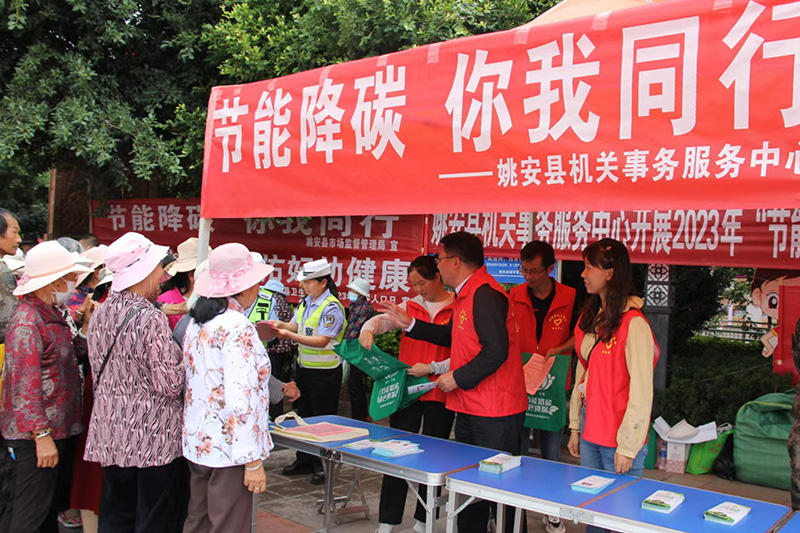 为深入贯彻习近平生态文明思想和绿色发展理念,倡导绿色生产生活方式,充分发挥公共机构在全社会绿色低碳发展中的示范引领作用,在全县营造节能低碳浓厚氛围,7月12日,姚安县机关事务服务中心牵头在梅葛广场开展以“节能降碳,你我同行”为主题的节能宣传活动,共有20余家单位参与此次宣传活动。