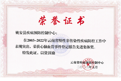 近日,在全省慢性非传染性疾病防控工作年会上,姚安县疾控中心在2003-2022年期间慢性非传染性疾病防控工作表现突出,被云南省疾控中心表彰为“死因登记报告工作先进集体”“心脑血管事件登记报告工作先进集体”“心血管高危人群早期筛查与综合干预项目先进集体”。