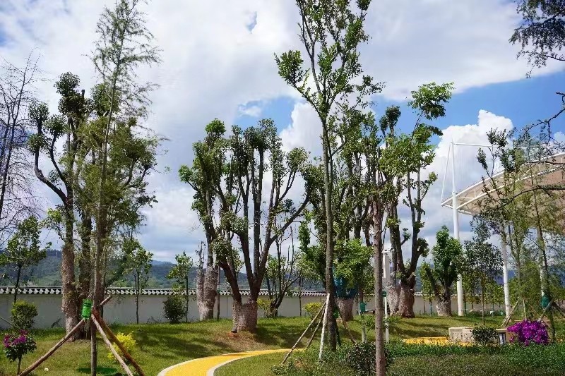 (一)充分整合资源,移栽本地优良树种。栋川小学集中绿地(游园)中的大树,是从姚安县第二幼儿园移栽过来的。因二幼改造园区,园内几棵参天大树都是本地树枝,都有着几十年的树龄,长得粗壮结实、枝繁叶茂,有滇朴、黄连木等优良品种。这样高品质的乔木,栋川小学岂能错过,于是栋川小学按照校园规划迅速整理出场地,把这一批参天大树迅速移栽过来,既节约了建设成本,贯彻落实了“提高种植本地树种”的文件精神。在学校的精心养护下,移栽的树木长势良好、生机勃勃。