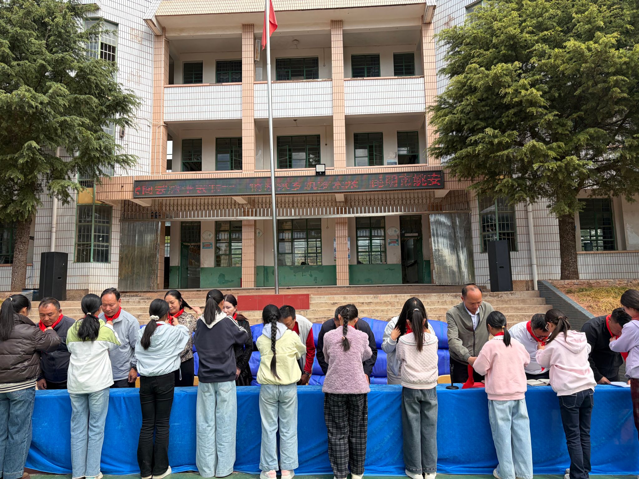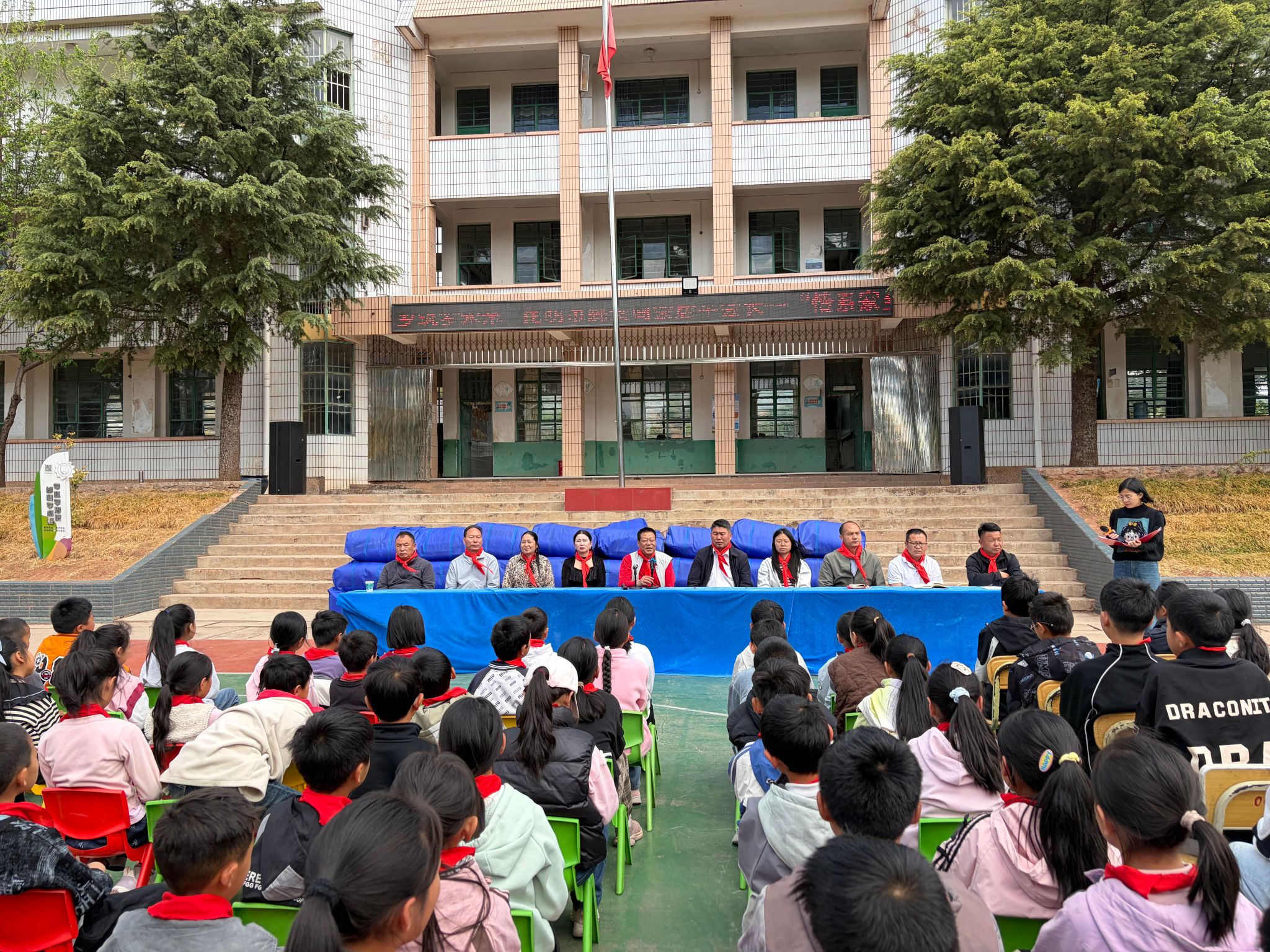 仪式上,少先队员代表为嘉宾敬献红领巾。前场中心小学校长致欢迎辞,对商会的爱心善举表示衷心感谢;唐平会长致辞,表达了反哺家乡教育、助力学子成长的初心;张建文局长发表讲话,对商会善举给予高度肯定,勉励师生感恩奋进。随后,双方完成捐赠牌交接,学校向商会回赠锦旗。