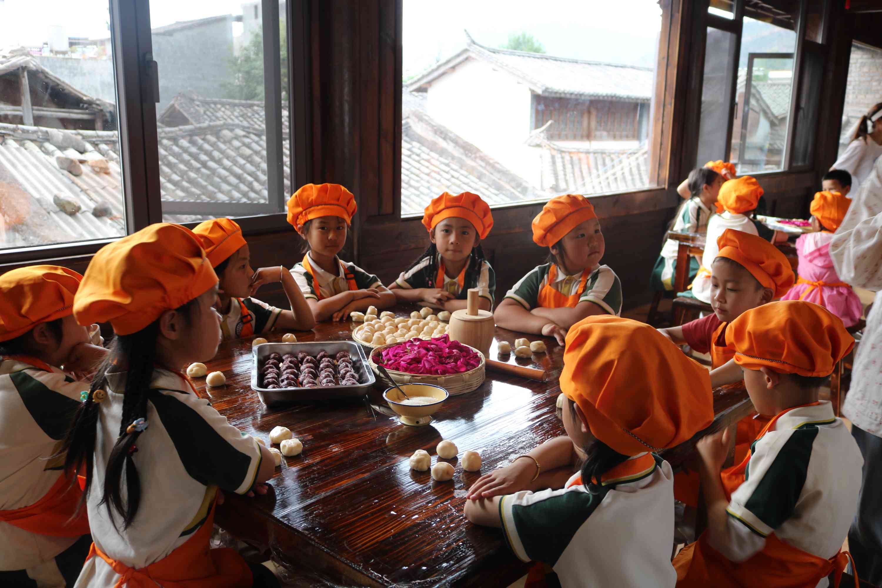 孩子们在老师的指导下,利用在玫瑰谷中收集到的花瓣,体验鲜花饼的制作中和面、制模、烘焙等过程,看着一个个形态各异的面团变成香喷喷的美食,孩子们的脸上洋溢着灿烂的笑容。