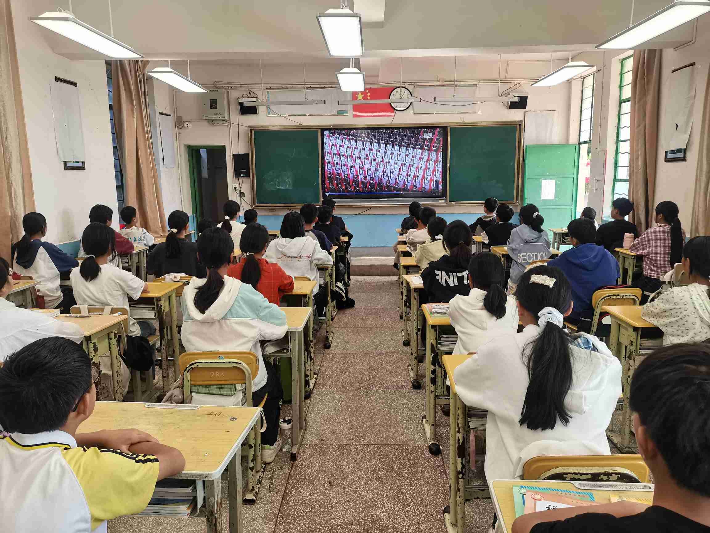 9月3日上午9时,学校组织全体师生观看纪念中国人民抗日战争暨世界反法西斯战争胜利80周年阅兵式。铿锵有力的步伐、洪亮震天的口号、庞大先进的国之重器,深深震撼了师生心灵。220班团员王焜湖观看后激动地表示:“生在春风里、长在阳光下,我们是最幸福的一代青年。我们为自己能够出生在这样繁荣昌盛的伟大祖国而骄傲!我们要好好学习,将来一定能建设更加强大、更加美丽的中国!”