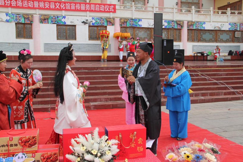 姚安县农戏协会戏曲艺术团现场进行了精彩的群众文艺演出。舞台剧《徐霞客游姚州》吸引了更多群众。整场节目共分三个篇章,第一章开篇《姚州游记》,第二章《徐霞客看戏》,第三章《徐霞客告别姚州》。演出六十分钟,现场发放宣传单500余份,同时展出姚安历史文物宣传展板10块。