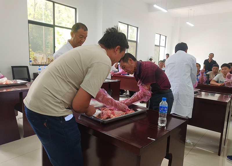 第二阶段,聘请了云南农业职业技术学院杨明建老师为学员授课,杨老师从母牛生殖系统构造、输精部位、输精操作要点、发情鉴定、精液的改冻等方面做了详细的技术讲解。在学员实操时,杨老师手把手指导学员进行了冻精解冻、活体子宫输精练习以及活牛人工授精实训考核。