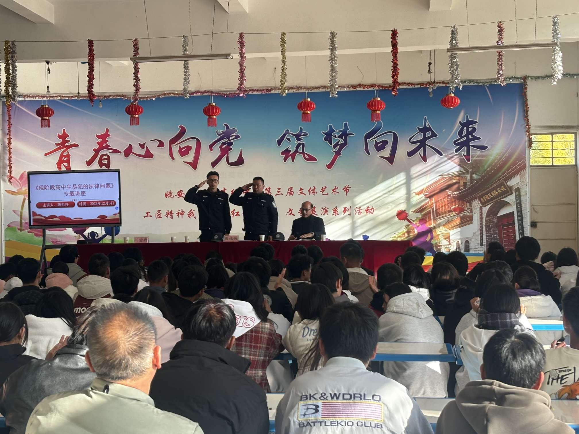 为深入推进校园法治建设,增强学生的法治观念和安全意识,姚安县职业高级中学于2024年12月5日举办了法治教育讲座,此次讲座由学校闫副校长主持,全体师生参与。