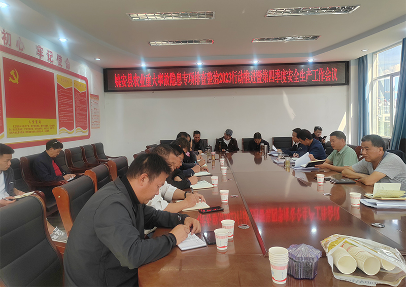 为认真贯彻落实全州农业安全生产重大事故隐患专项排查整治2023行动推进会议精神,姚安县农业农村局于2023年10月31日在召开了9个乡镇农业农村服务中心主任及局属各单位、股室负责人参加的全县农业安全生产重大事故隐患专项排查整治2023行动推进暨第四季度安全生产工作会议。