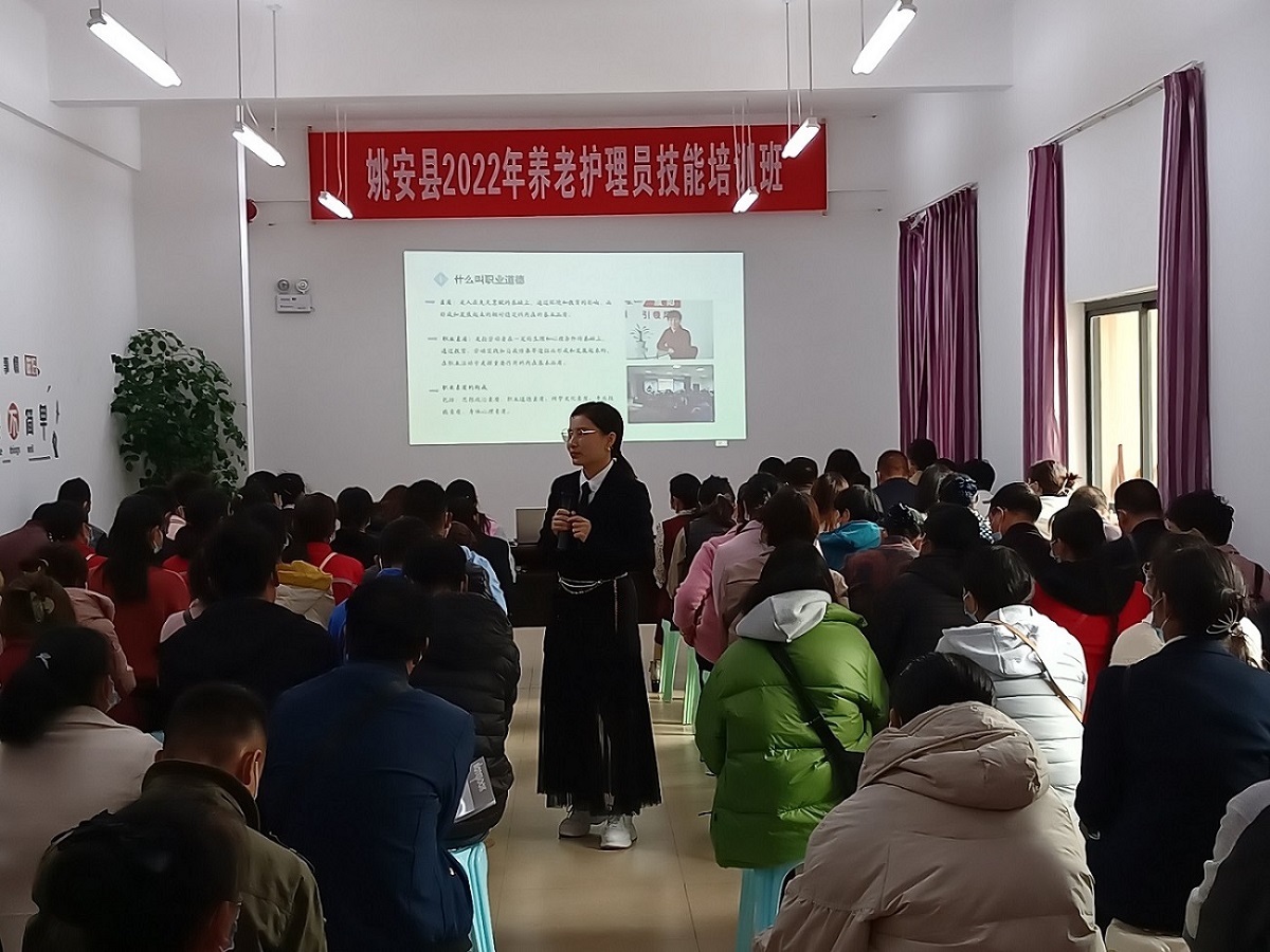 为进一步做好我县老年人照顾服务工作,逐步提高全县养老服务业从业人员职业素质和护理人员技能水平,不断提升养老机构的服务质量和服务水平,在姚安县总工会的大力支持下,2022年10月25日姚安县民政局在姚安县乐养中心举办了为期一天的“2022年养老护理员技能培训班”。县民政局副局长徐勇出席开班仪式。姚安县中心敬老院、姚安乐养中心、姚安禾瑞康养中心、5个乡镇敬老院的护理员、工作人员以及9个乡镇从事民政工作和养老服务工作100余人参加了培训。