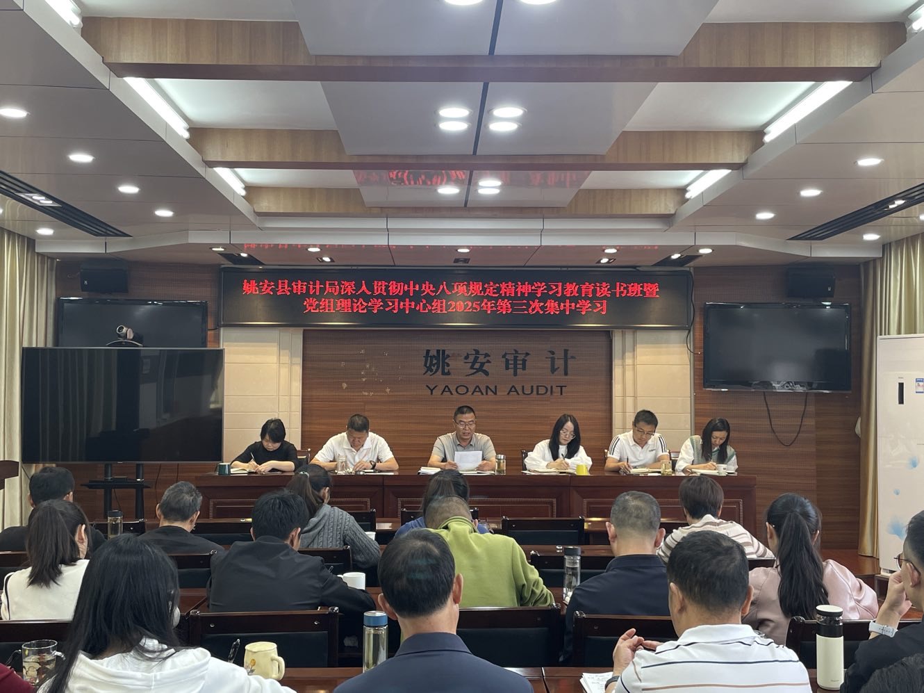 近日,姚安县审计局举办深入贯彻中央八项规定精神学习教育读书班暨党组理论学习中心组2025年第3次集中学习。认真学习习近平总书记关于加强党的作风建设的重要论述、中央八项规定及其实施细则精神、习近平总书记考察云南重要讲话精神,2位干部职工作交流发言,推动全局深入贯彻中央八项规定精神学习教育扎实开展。