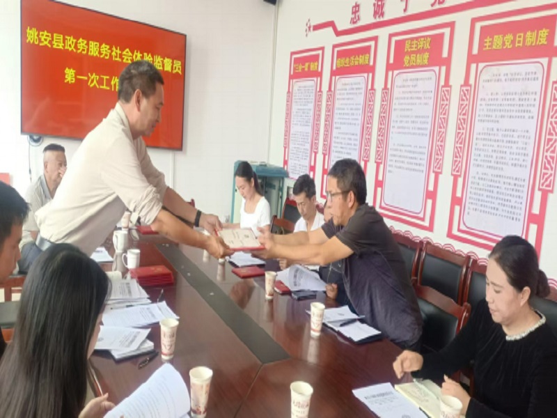 会上,政务服务局副局长段海洪同志传达学习省州政务服务相关政策文件,通报我县今年政务服务工作情况,宣读了县政务服务局聘任10位政务服务社会体验监督员的决定,并为政务服务社会体验监督员颁发了聘书,标志着我县政务服务社会体验监督员正式上任。这支政务服务社会体验监督员队伍的建立,是姚安县贯彻落实“放管服”改革,优化营商环境,提升政务服务能力,提升政务服务满意度的一项重要举措。