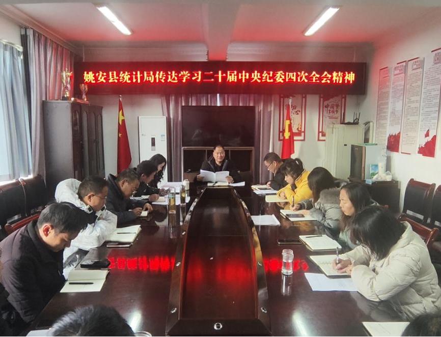 会议强调,全体党员干部要深入学习贯彻二十届中央纪委四次全会精神,切实把思想和行动统一到习近平总书记重要讲话精神和全会决策部署上来,增强“四个意识”、坚定“四个自信”、做到“两个维护”,深入贯彻落实中央八项规定精神,勇于自我革命,筑牢不敢腐、不能腐、不想腐的思想防线,以昂扬的精神风貌和过硬的工作作风,不断增强全面从严治党的坚定决心,为姚安县经济社会高质量发展提供更加优质高效的统计服务保障。