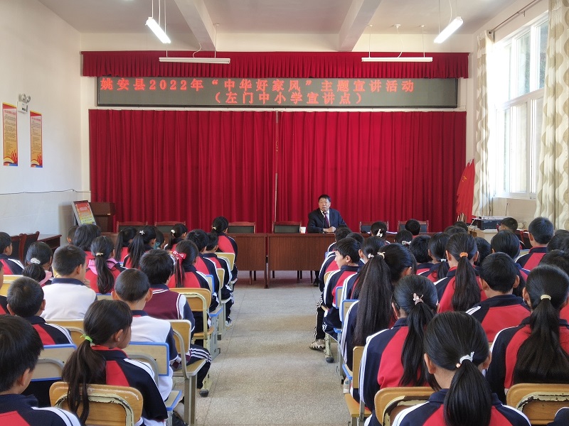 2022年11月3日上午,姚安县“中华好家风”主题宣讲团成员到左门中学、左门中心小学开展讲座。