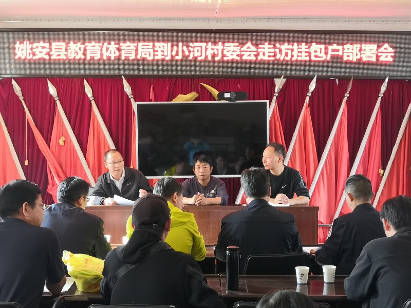 县教育体育局到小河村委会走访挂包户部署会议在小河村委会会议室举行。县教育体育局副局长胡荣华主持会议。小河村委书记李东昌从返贫动态监测、产业发展、环境治理、防溺水、疫情防控等方面介绍了工作开展情况及面临的困难;并对县教育体育局在消费帮扶、结对帮扶、项目帮扶、教育帮扶等方面的支持表示感谢。县教育体育局驻小河村帮扶第一书记杨文学就此次走访活动要注意的事项作强调。县教育体育局副局长胡荣华对小河村的工作给予肯定,要求村委会和驻村工作队要抓党建树品牌,重发展促增收,保稳定促和谐,对此次走访活动作部署。