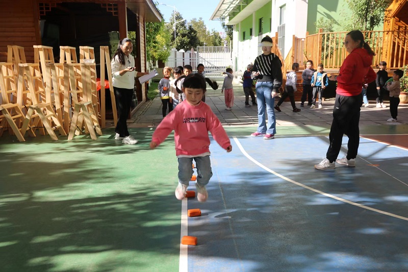 幼儿健康体质测试是评价幼儿在园健康发展的科学途径之一。近日,县幼儿园组织全园幼儿开展体质测试活动。测试的项目为:身高、体重、坐高、胸围、十米折返跑、平衡木、坐位体前屈、双脚连续跳、网球掷远和立定跳远。