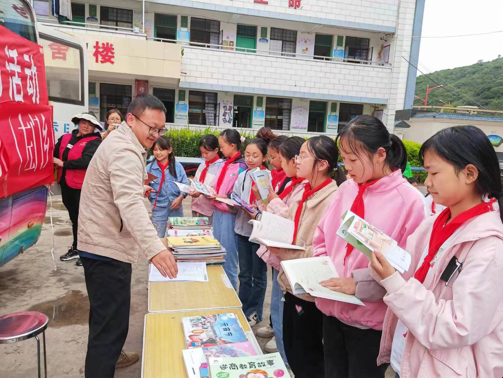 姚安县图书馆向太平镇中心小学捐赠图书100余册,包括了儿童课外读物、科普、文学等多种类型。图书馆工作人员为孩子们普及了图书馆的功能作用及图书借阅证的办理等相关知识、为孩子们发放了学习用品,并带领着孩子们走进流动图书车,阅读了图书车内摆放的绘本、中外名著、经典童话故事、百科全书、儿童文学等图书。