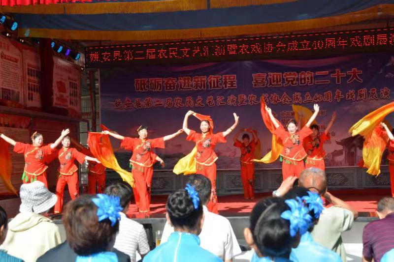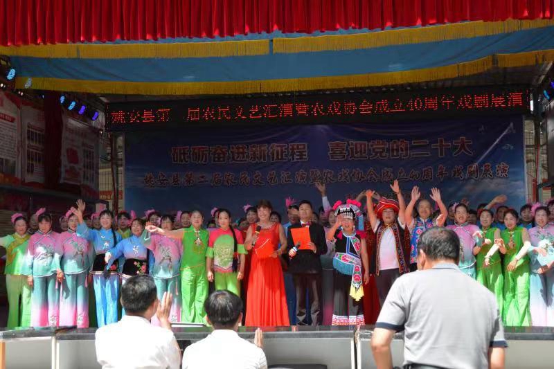 高歌奋进铸辉煌,凝心聚力谱华章。为庆祝中国共产党成立101周年,喜迎党的二十大胜利召开,进一步把习近平总书记在庆祝中国共产党成立100周年大会上的重要讲话精神往深里走、往心里走、往实里走,落地生根。把姚安优秀民族文化进一步挖掘和传承,保护和发展,繁荣基层文化,丰富群众精神生活,使文化热在基层,亮在基层,暖在民心,7月11日上午,姚安县举行了“喜迎党的二十大、奋进新征程”农民文艺汇演暨农戏协会成立40周年戏剧展演直播活动。