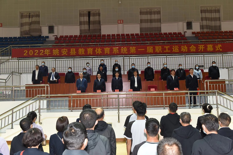 2022年10月10日下午7:30,由县教育体育局主办、姚安县大成中学承办的“姚安县教育体育系统首届职工运动会”在县体育馆胜利开幕。38支代表队、500余名运动员在运动员进行曲伴奏下有序入场。开幕式在庄严的国歌声中拉开帷幕。