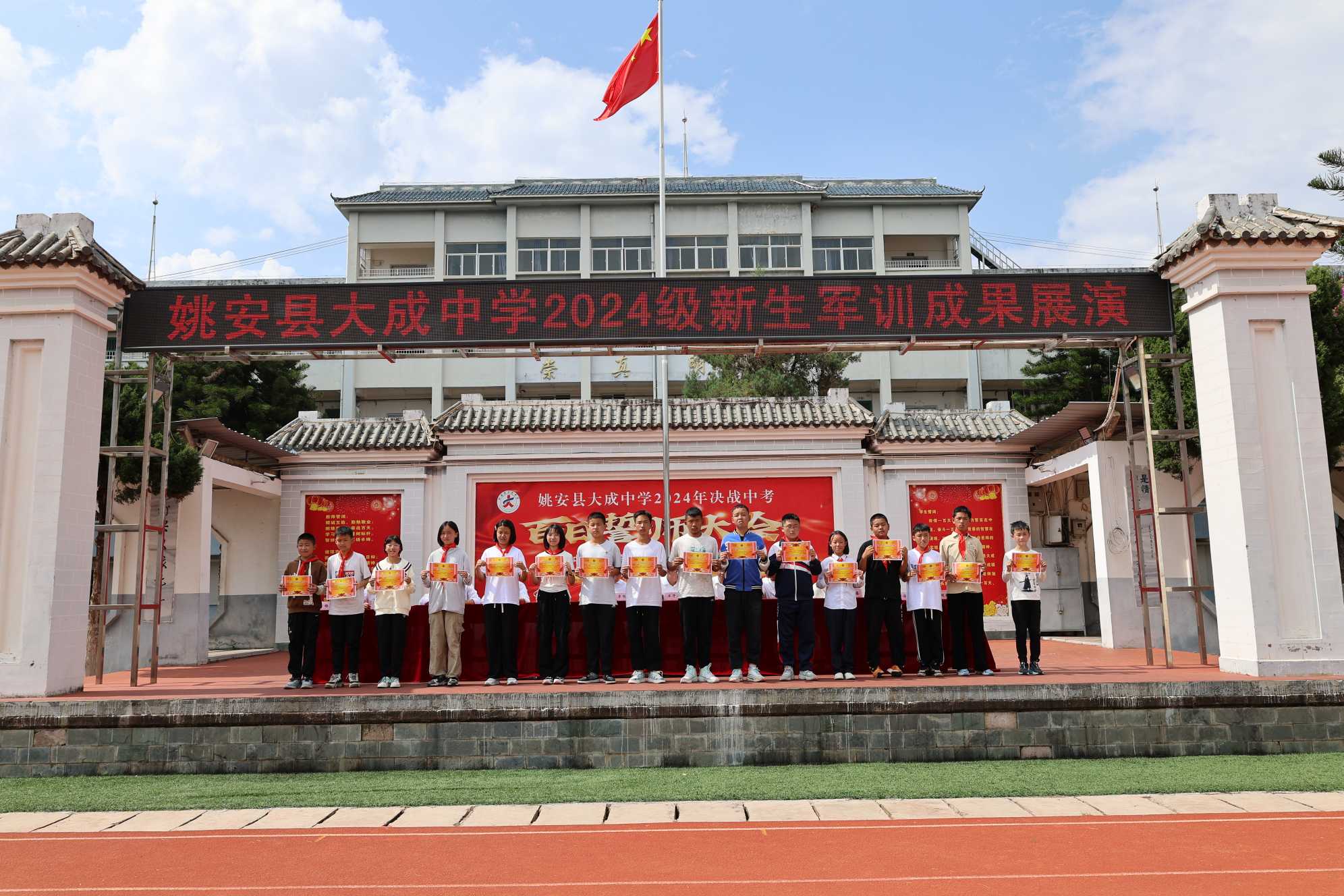 在训练中,同学们发扬了不怕苦、不怕累的精神,克服了晴天的高温天气、战胜了阴天的风吹雨淋。他们始终服从命令、积极参与,严守纪律、勇于挑战。他们以饱满的热情、昂扬的斗志、威武的军姿展示了当代中学生朝气蓬勃的精神风貌,展示了大成学子奋发向上的青春风采。各方队教官以身作则,悉心指导,严格要求,在训练过程中渗透了“听党指挥、能打胜仗、作风优良、纪律严明”的新时代治军思想,为青年学子植入了红色基因。