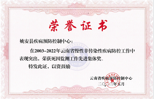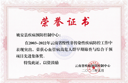 近日,在全省慢性非传染性疾病防控工作年会上,姚安县疾控中心在2003-2022年期间慢性非传染性疾病防控工作表现突出,被云南省疾控中心表彰为“死因登记报告工作先进集体”“心脑血管事件登记报告工作先进集体”“心血管高危人群早期筛查与综合干预项目先进集体”。