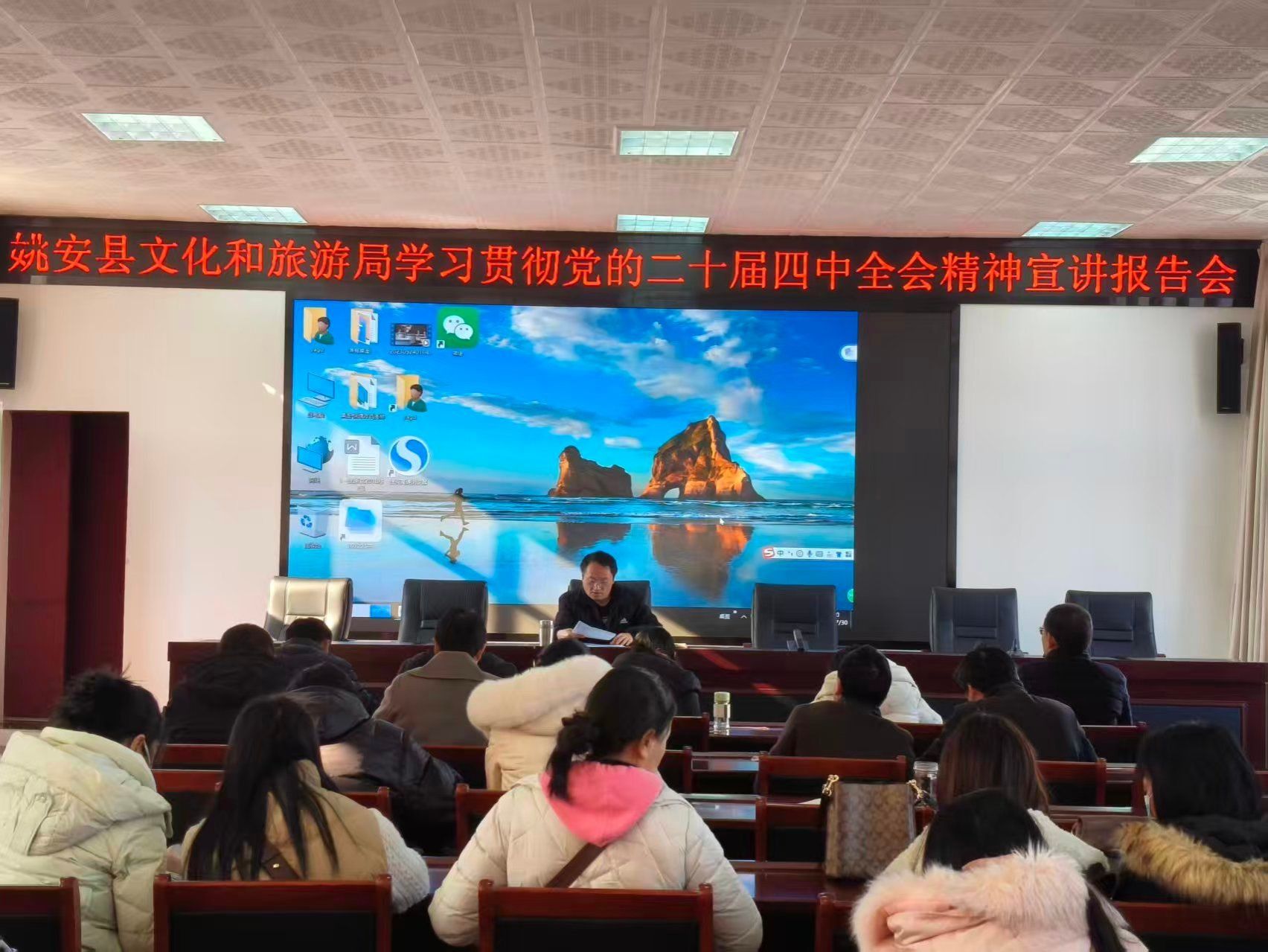 为深入学习贯彻党的二十届四中全会精神,切实把干部职工的思想和行动统一到党中央决策部署上来,根据县委的统一安排和部署,12月15日上午,姚安县文化和旅游局组织召开学习贯彻党的二十届四中全会精神宣讲报告会。