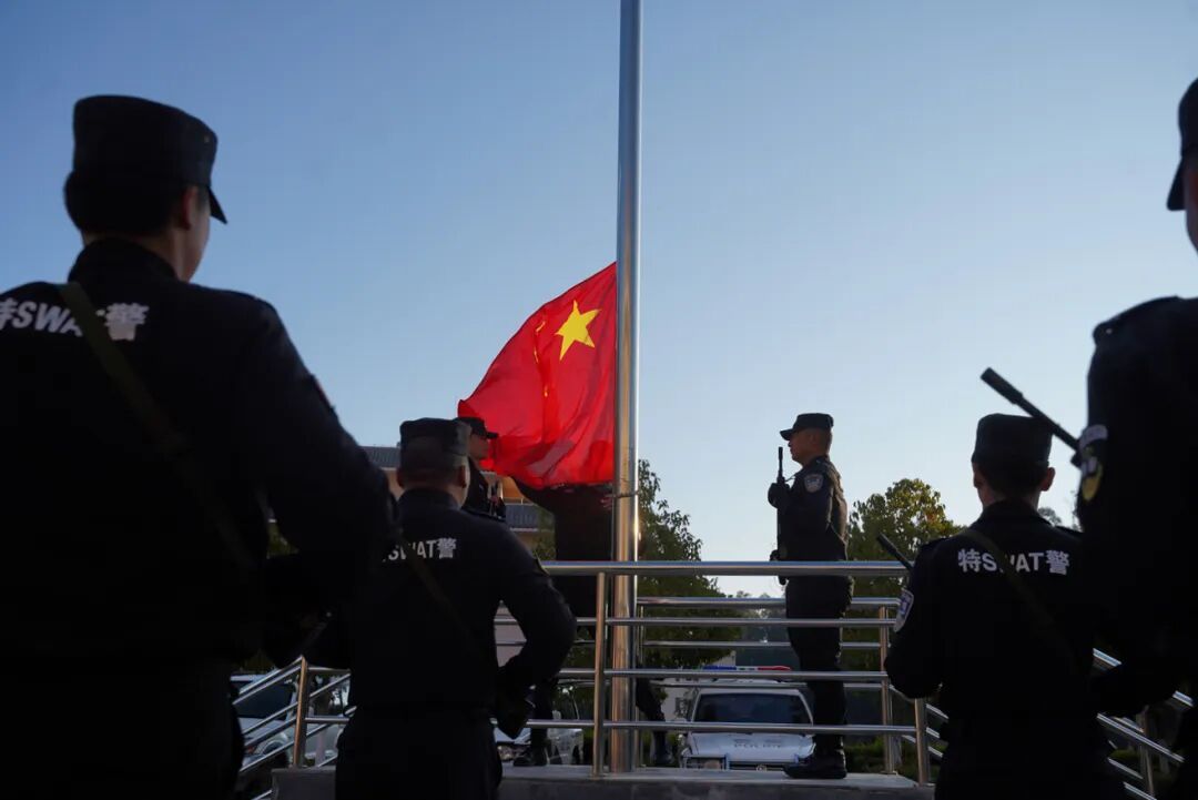 护旗手昂首阔步,迈着铿锵有力的步伐,五星红旗伴随着国歌声冉冉升起,随风飘扬。在雄壮的国歌声中,全体民警、辅警整装列队,向国旗敬礼、对国旗宣誓、以国旗为荣,抒发对伟大祖国的崇敬和热爱之情。