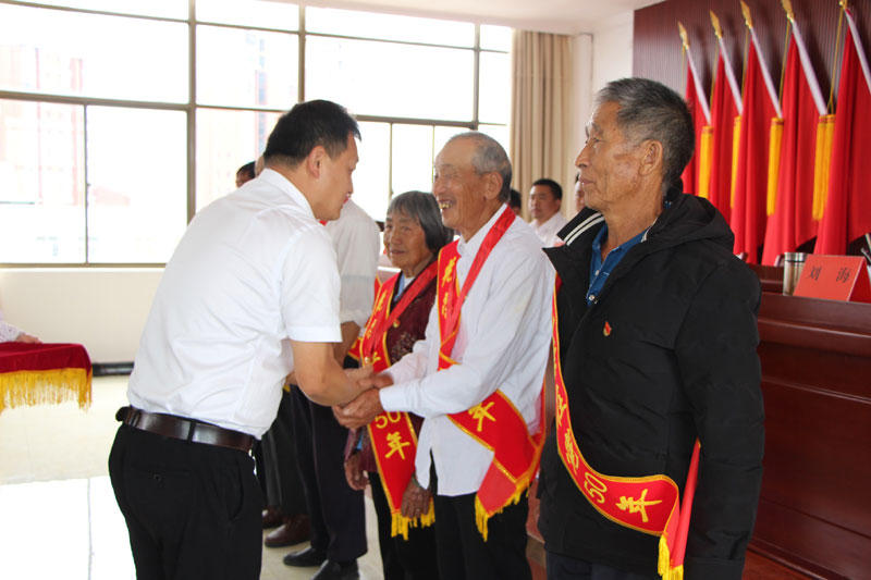 镇党委书记郑建华为6名党龄达到50周年、一贯表现良好的老党员代表逐一颁发“光荣在党50年”纪念章。