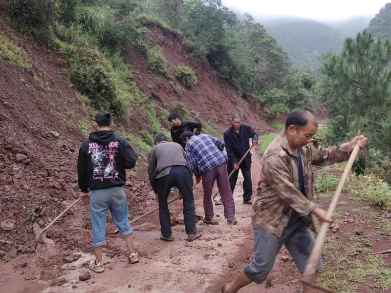 一旦出现险情,应急队伍迅速行动。在大河口主干道抢险现场,近百名乡村干部与自发赶来的群众组成抢险队伍,冒雨挥舞铁锹清理路面塌方石块,配合大型机械疏通堵塞的排水管道,经过连续10多个小时奋战,恢复道路基本通行条件;在河道沿岸与地质灾害隐患点,党员干部穿着雨衣雨鞋,手持砍刀锯子清理倒塌树木,设置警示标志与防护栏,引导车辆绕行;作为防汛包片责任人,乡长杨文龙同志更是第一时间带队深入村组,逐户排查危房险情,组织群众转移至临时安置点,并送去食品、饮用水等生活物资,用行动诠释“守土有责、守土尽责”。