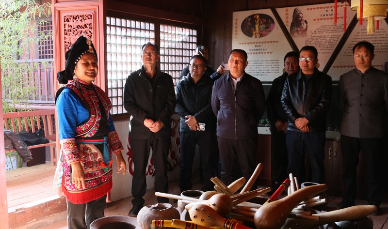 随后,考察组前往马游村义学馆观摩非遗技艺展演。省级梅葛传承人罗英以原生态的梅葛调演唱了传统史诗片段,其悠远深情的歌声展现了彝族人民对自然与生命的敬畏,令在场代表深受触动。芦笙制作技艺传承人郭自林则通过实物展示与现场演示,讲解了芦笙选材、制作工艺及演奏技巧的奥秘。代表们近距离观摩了芦笙制作的精细工序,并亲身体验了芦笙吹奏,对传统手工艺的匠心精神与艺术价值有了更直观的认知。