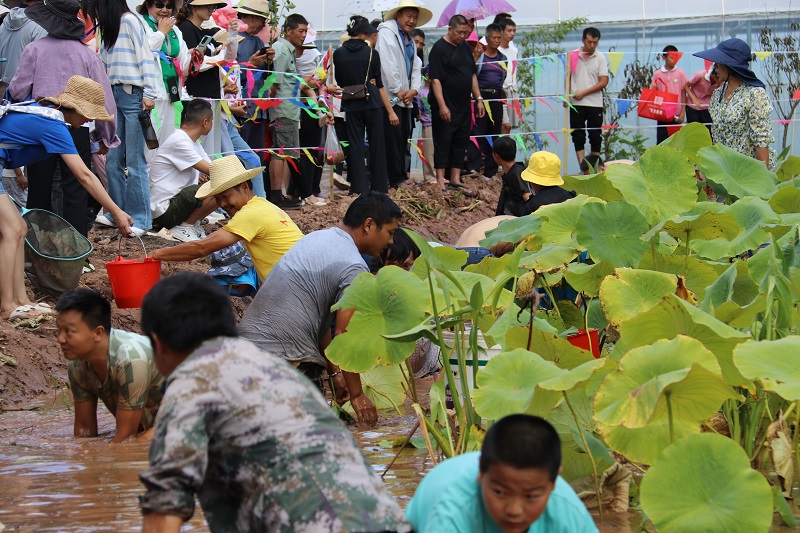 徒手摸鱼,趣味横生。“围、追、堵、截”,与鱼“斗智斗勇”,有的人默默摸索,等待良机;有的人四处游走,迅猛发力,一击即中。摸鱼现场热闹非凡,过程的欢乐、收获的喜悦感染了在场的所有人。与此同时,荷塘垂钓区的“钓友们”聚精会神,挂饵、抛竿各显身手,随着水花泛起阵阵涟漪,用力提竿,鱼儿跃水而出,引来阵阵欢呼。