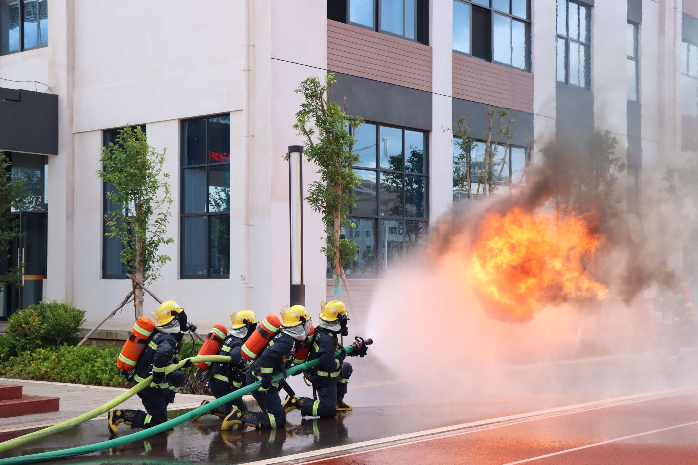 会议首先进行现场学习观摩,栋川小学校长王进红向参会人员介绍了学校消防设施建设及管理使用情况,担任本次演练活动的总指挥,演练现场,随着烟雾弥漫,消防警报响起,教学楼内1200余名师生在学校的指挥下跟随引导人员迅速、有序逃离现场,模拟被困师生得到消防员的及时救助。在学校操场上,消防救援人员为师生们现场示范了消防栓、灭火器的正确使用方法。