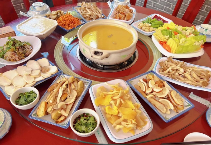 1.野生菌火锅。文火慢炖的鸡汤,加入松茸、鸡枞、竹荪等各种山珍,鸡汤中充斥着野生菌的浓郁,“菌鲜+鸡鲜”两“鲜”碰撞,味道鲜美独特,香气四溢。