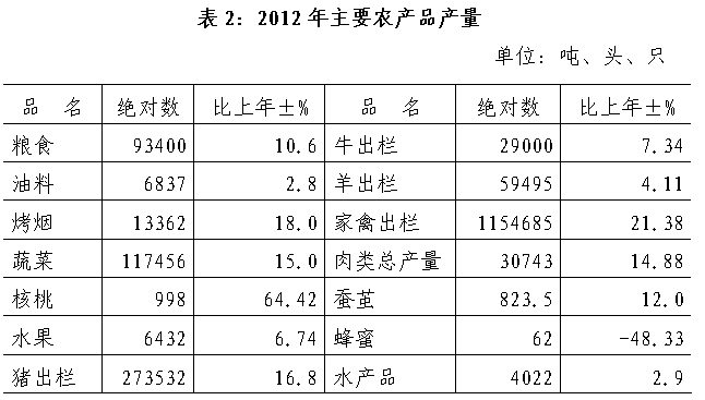 全年粮食总产量93400吨,增加8965吨,增长10.6%,其中:夏收粮食25427吨,增加615吨,增长2.48%。稻谷26816吨, 下降11.4%;小麦产量8387吨,下降2.3%;玉米产量37190吨,增长58.92%;豆类产量11887吨,下降4.58%。蔬菜产量(含人工食用菌产量)117456吨,增长15%;油料作物产量6837吨,增长2.75%。全年收购烟叶1150万公斤,实现收购总值2.63亿元,均价达22.88元/公斤,比上年提高4.56元/公斤。全年新栽桑1879亩,养蚕2.34万张,产茧823.5吨,蚕丝业总产值达0.76亿元。