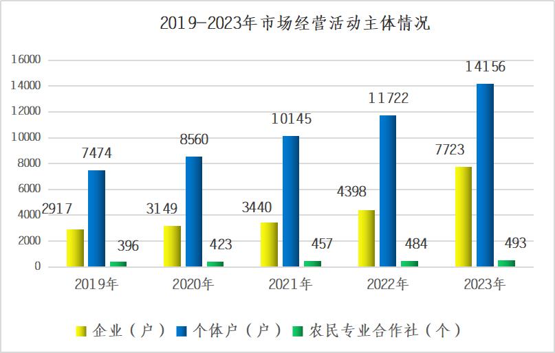 市场主体持续增加。2023年全县市场主体登记注册增加5768户,年末各类市场主体登记注册达到22372户。